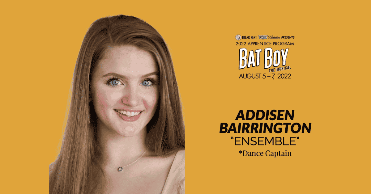 Addisen Bairrington returns to the Casa Mañana stage to make her Apprentice Program debut in the ensemble of Bat Boy the Musical! From the time she was little, she performed at her church, which sparked her love of theatre!